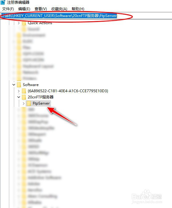 依次展开"计算机\HKEY_CURRENT_USER\Software\20cnFTP服务器\FtpServer"节点。