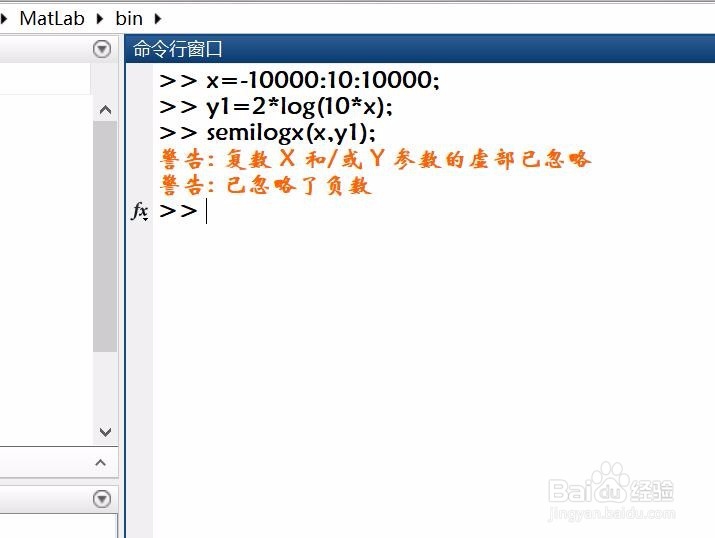 第四步,使用函数semilogx(x,y1);在一张图中绘制对x轴刻度采用对数(以10为底的对数)的图像,y轴采用正常刻度。如果使用y轴刻度采用对数(以10为底的对数),使用函数semilogy(x,y1)进行绘制。