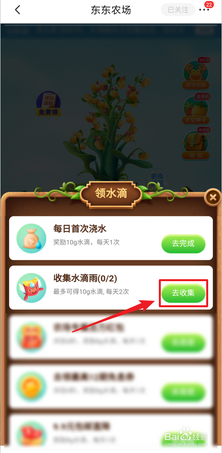打开【领水滴】任务列表框后,点击收集水滴雨右侧的【去收集】按钮。
