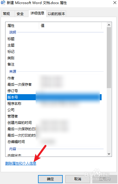 电脑中创建的文档信息,在属性中可选择信息并删除。