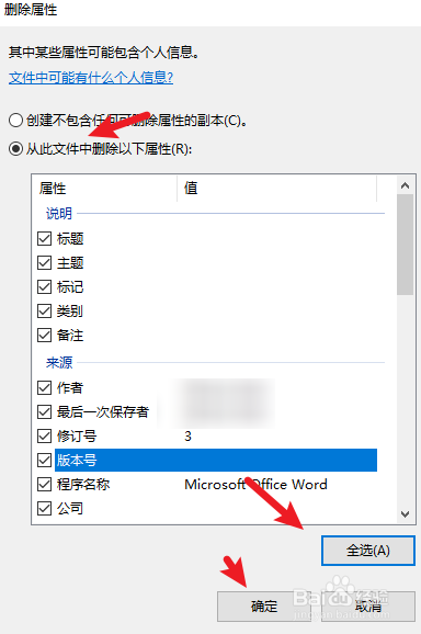 点击【从此文件中删除以下属性】并全选,点击确定。