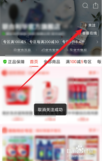 关注店铺的页面,点击已关注按钮,会提示取消关注成功字样