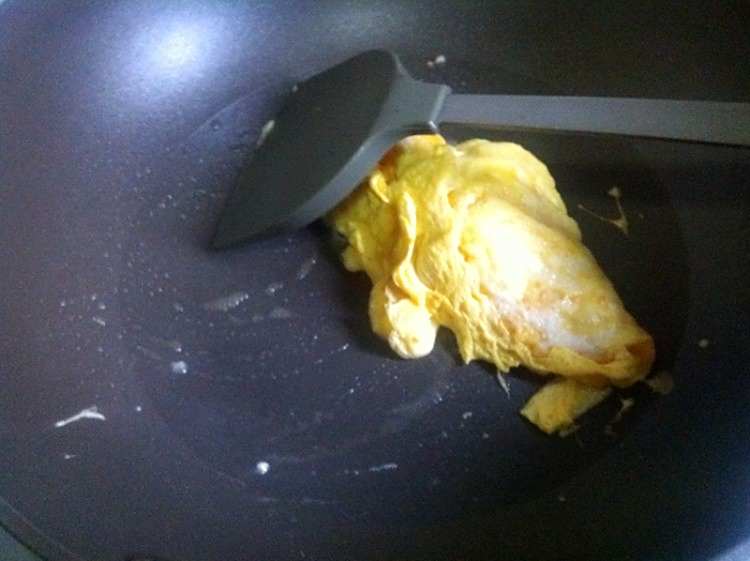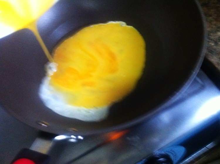 10、油冒烟后倒入蛋液。