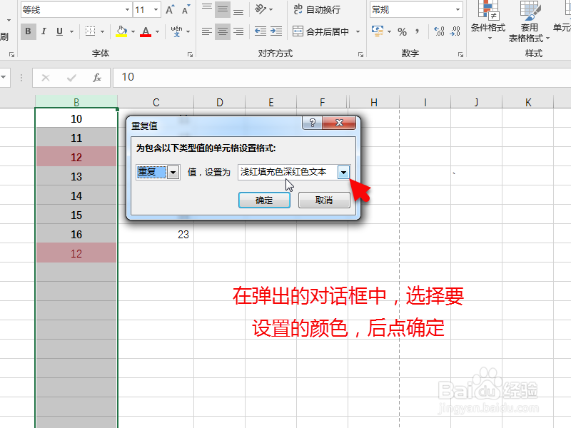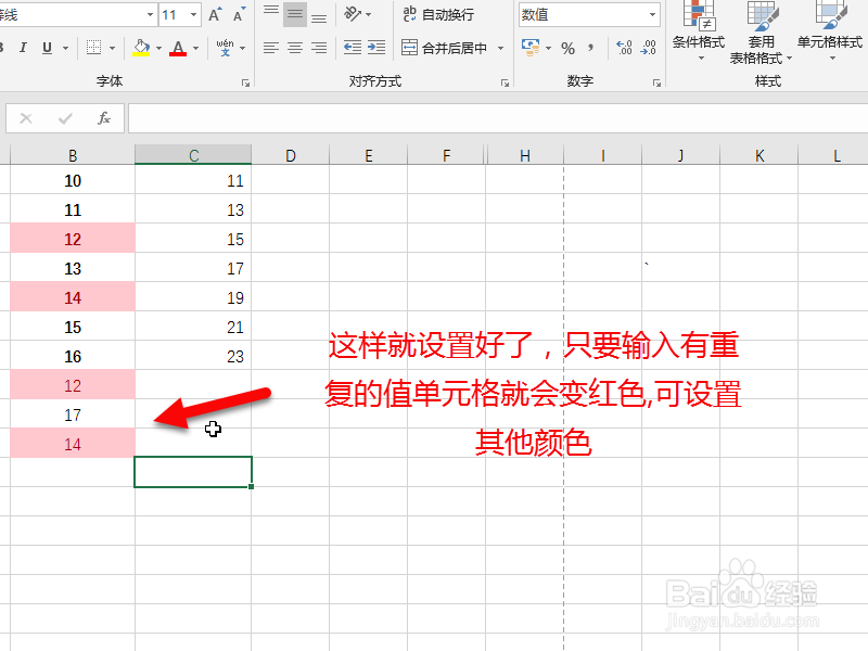 这样就设置好了,只要输入有重复的值单元格就会变红色,可设置其他颜色