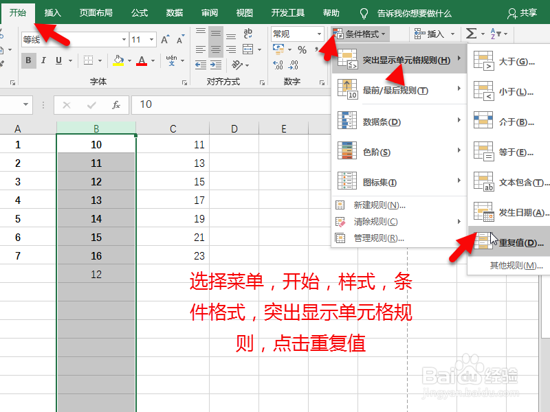 选择菜单,开始,样式,条件格式,突出显示单元格规则,点击重复值