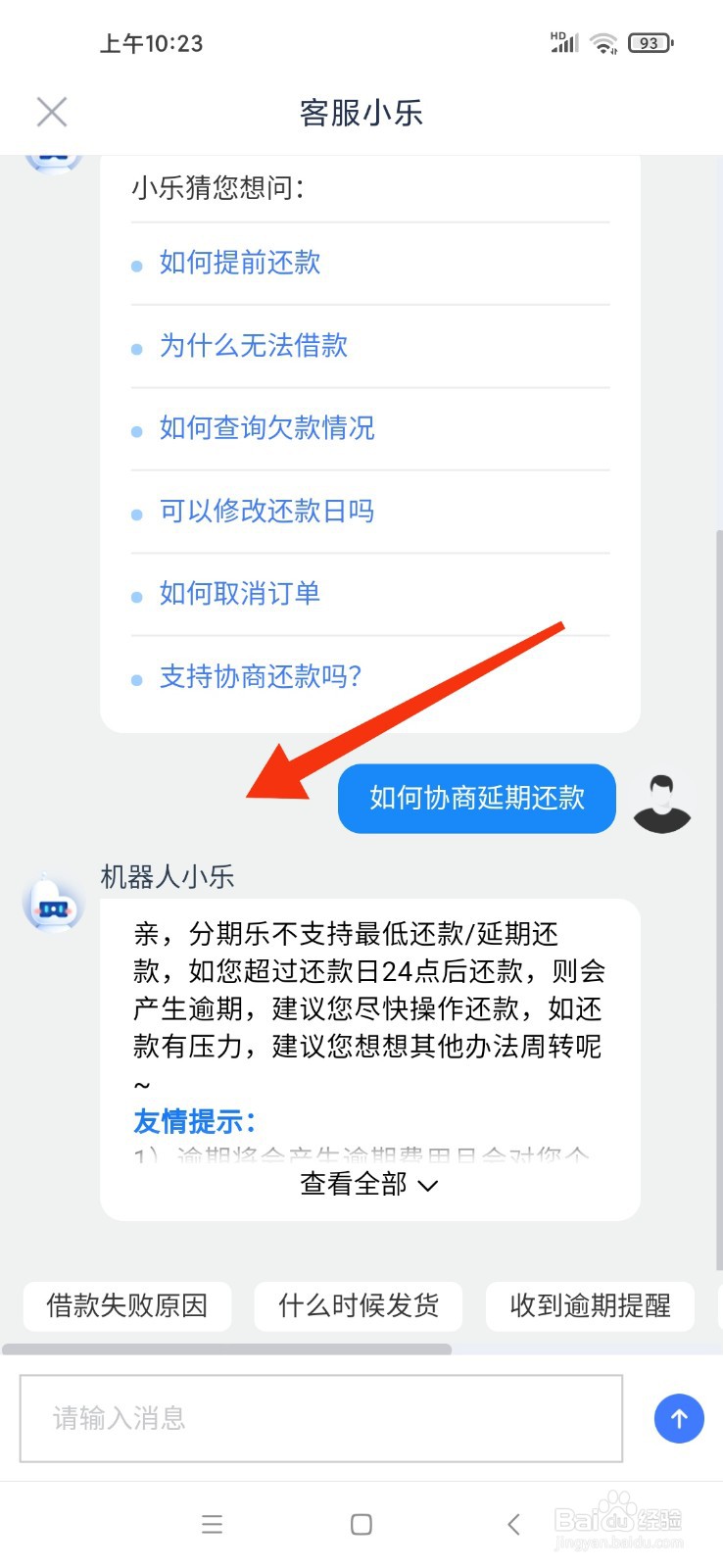 点击在线客服(推荐,响应更快),如下图,发送如何协商延期还款,看到客服的回复就知道了