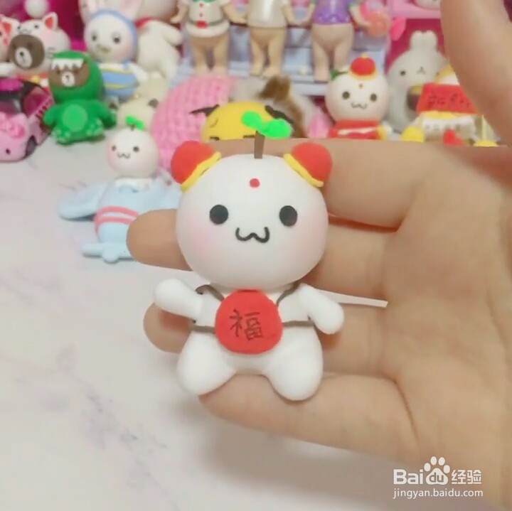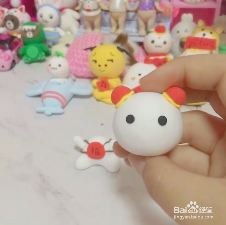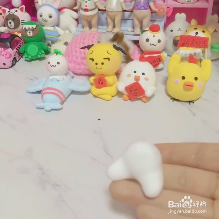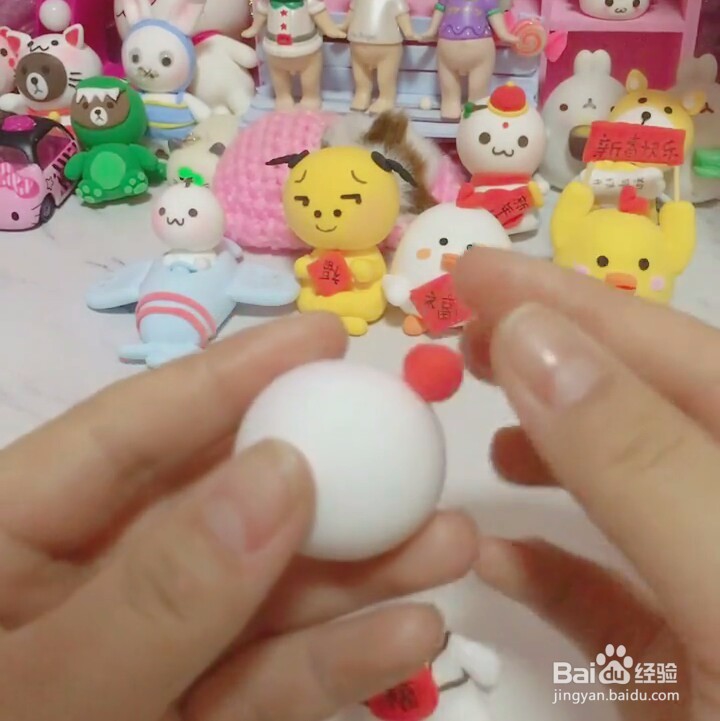 取适量的白色黏土,揉搓一个小脑袋的形状,再把刚刚的红色粘土做成小耳朵,如图所示。