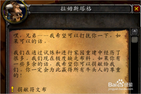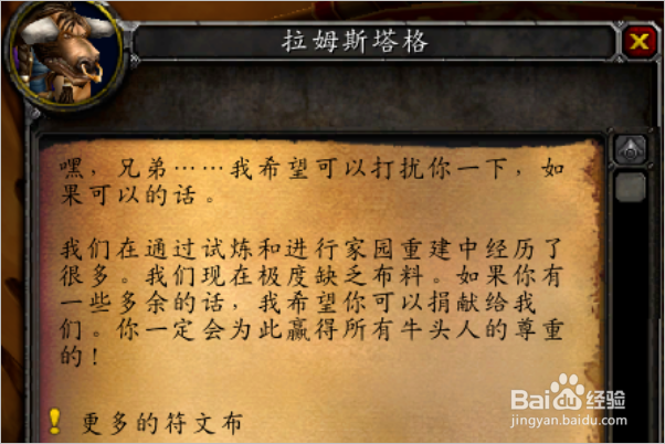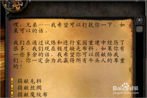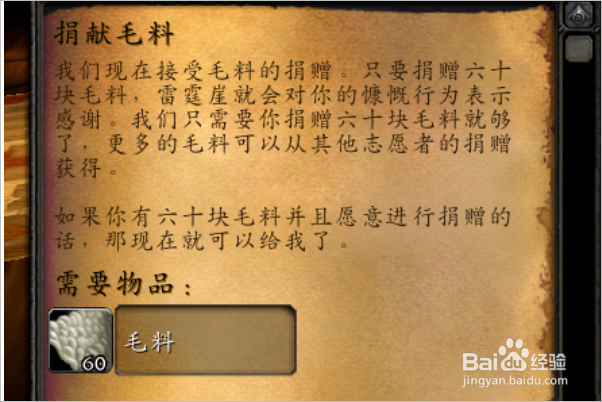 毛料、丝绸和魔纹布各捐献一次以后,可以接到捐献符文布的任务,同样是需要3组,奖励150点声望。