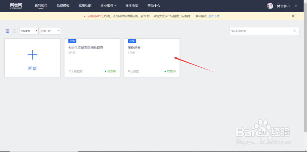 我们可以看到属于我们的问卷调查,示例问卷会教会我们如何写问卷调查,这里就不多说了。