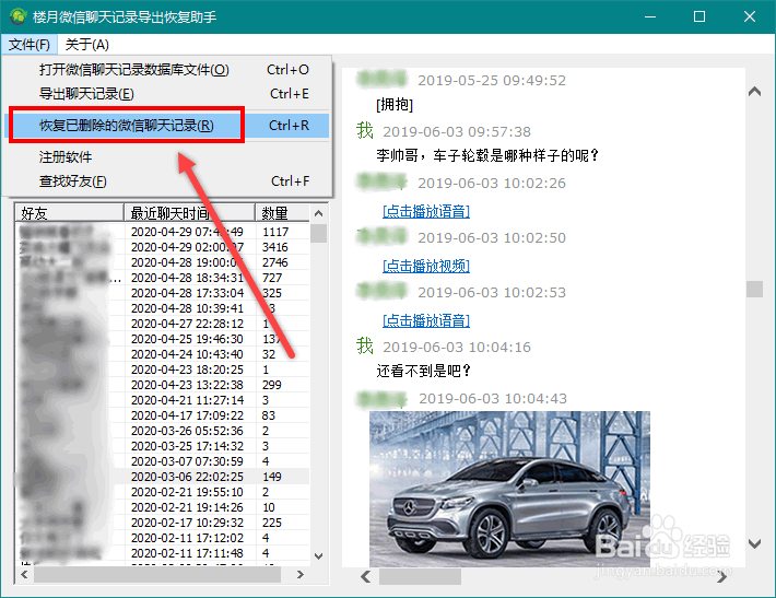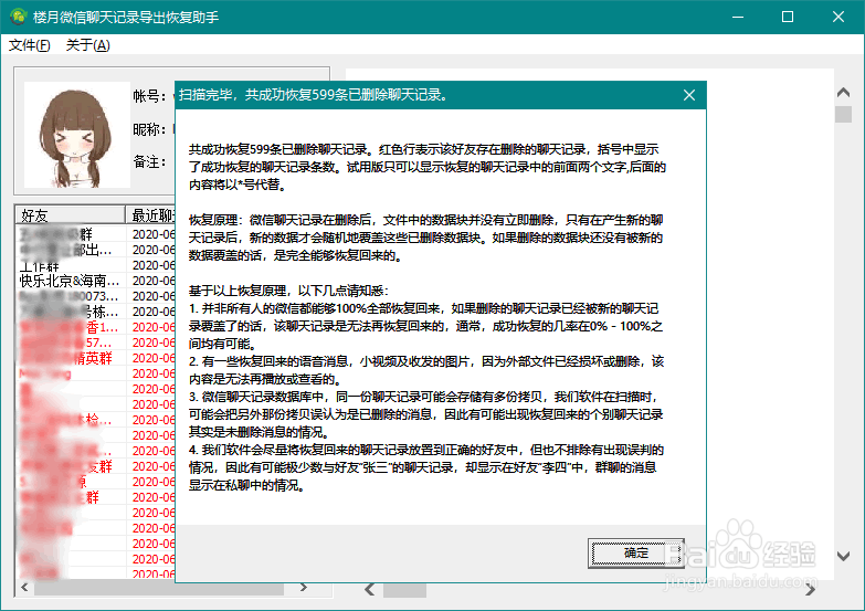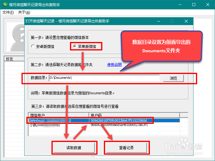 接下来要用到的数据恢复软件名称为楼月微信聊天记录导出恢复助手,通过该软件读取之前提取出来的Documents文件夹。