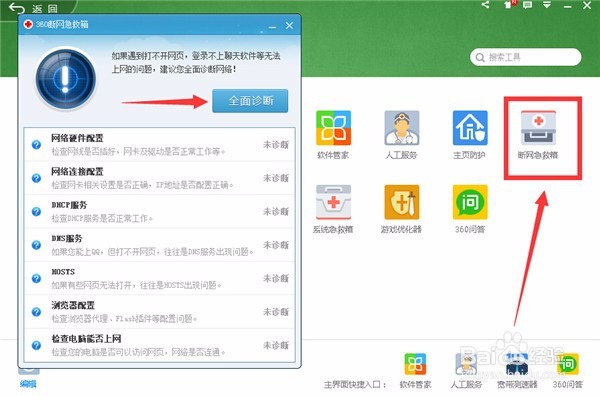 然后使用360急救箱,修复一下网络卡顿的问题。