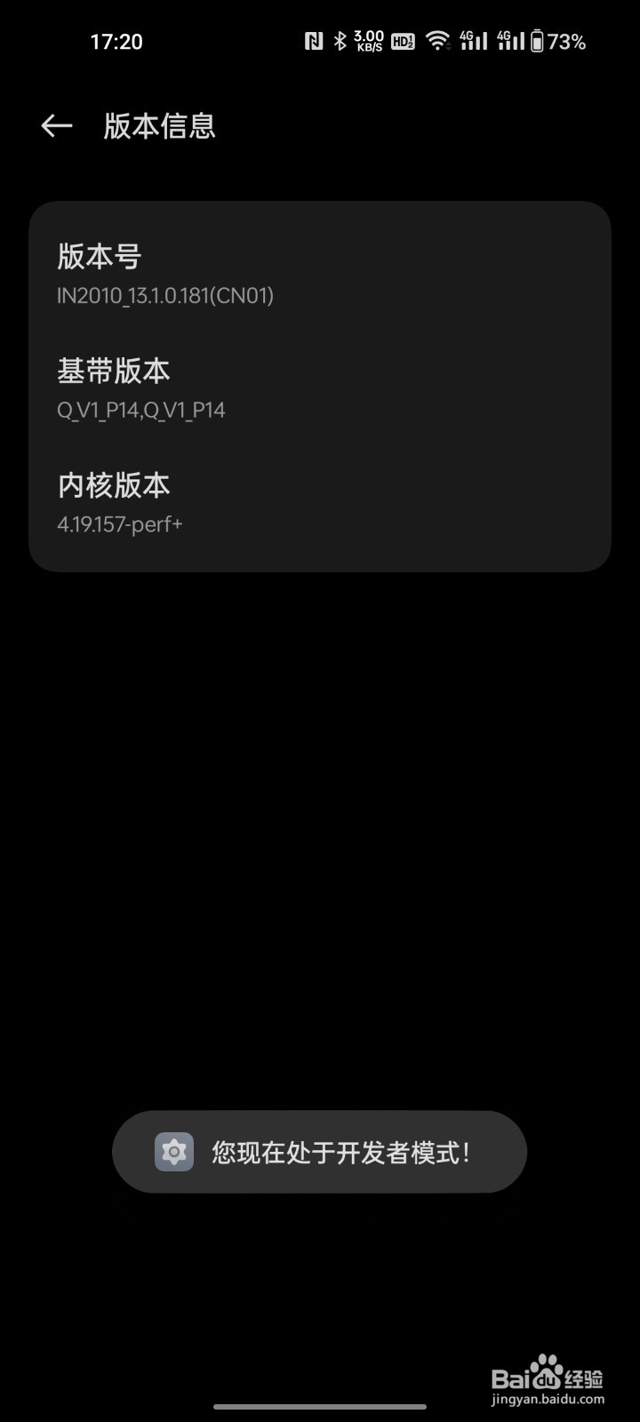 点击版本号七次并输入锁屏密码,系统提示“您正处于开发者模式”时即为成功
