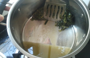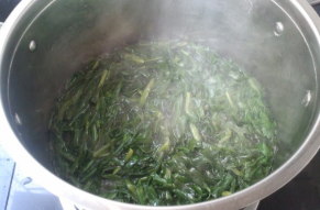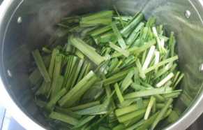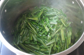 5、韭菜慢慢开始变黄,继续熬煮,仍然要不时拨拉一下
