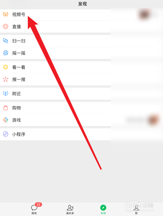 打开微信APP,如图所示在发现页面点击视频号。