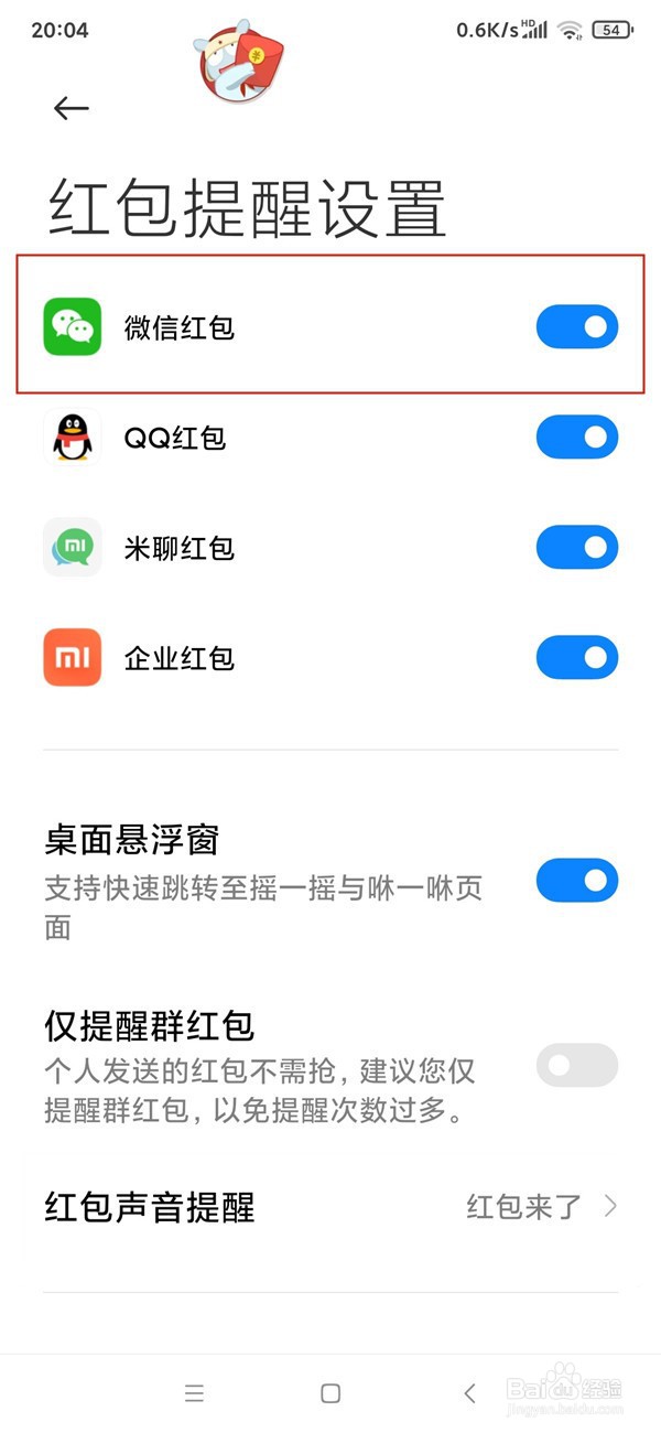 将微信红包右侧的按钮勾选即可。