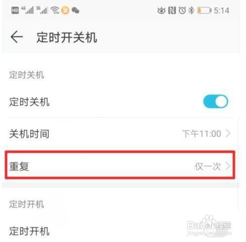 打开定时关机的选项,然后设置关机时间,同时点击重复的选项进入