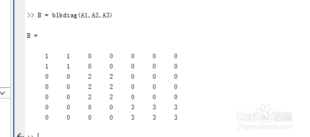 在matlab命令行输入:B = blkdiag(A1,A2,A3)。