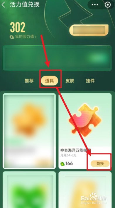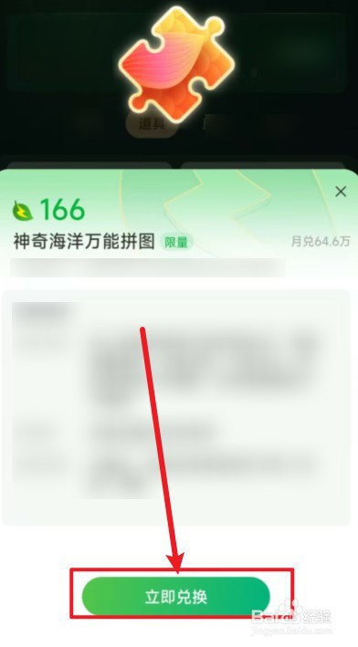 点击【立即兑换】按钮,使用166活力值兑换一个神奇海洋万能拼图。