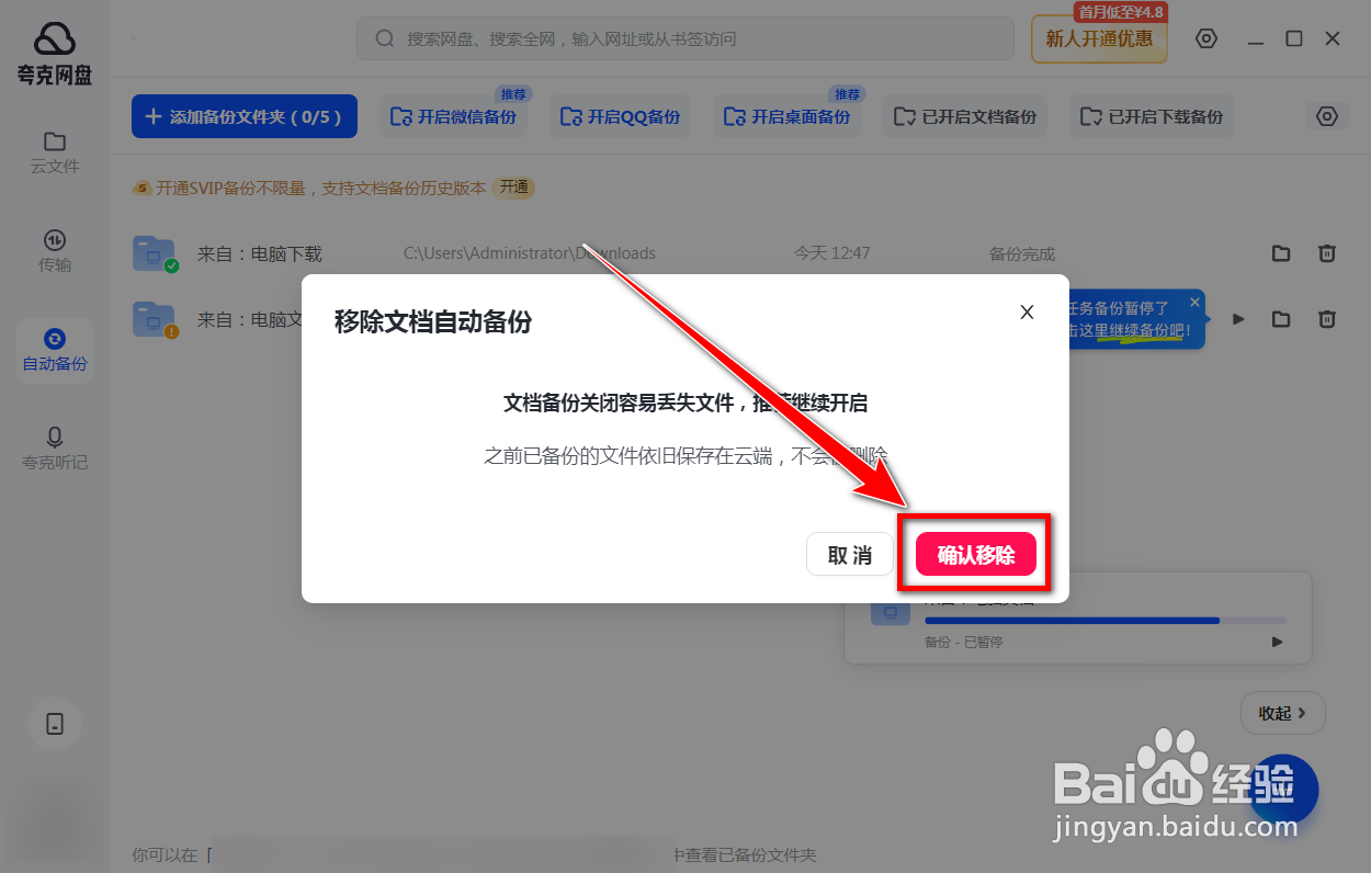 在“移除自动备份”窗口中,点击“确认移除”按钮,便可取消此自动备份任务。