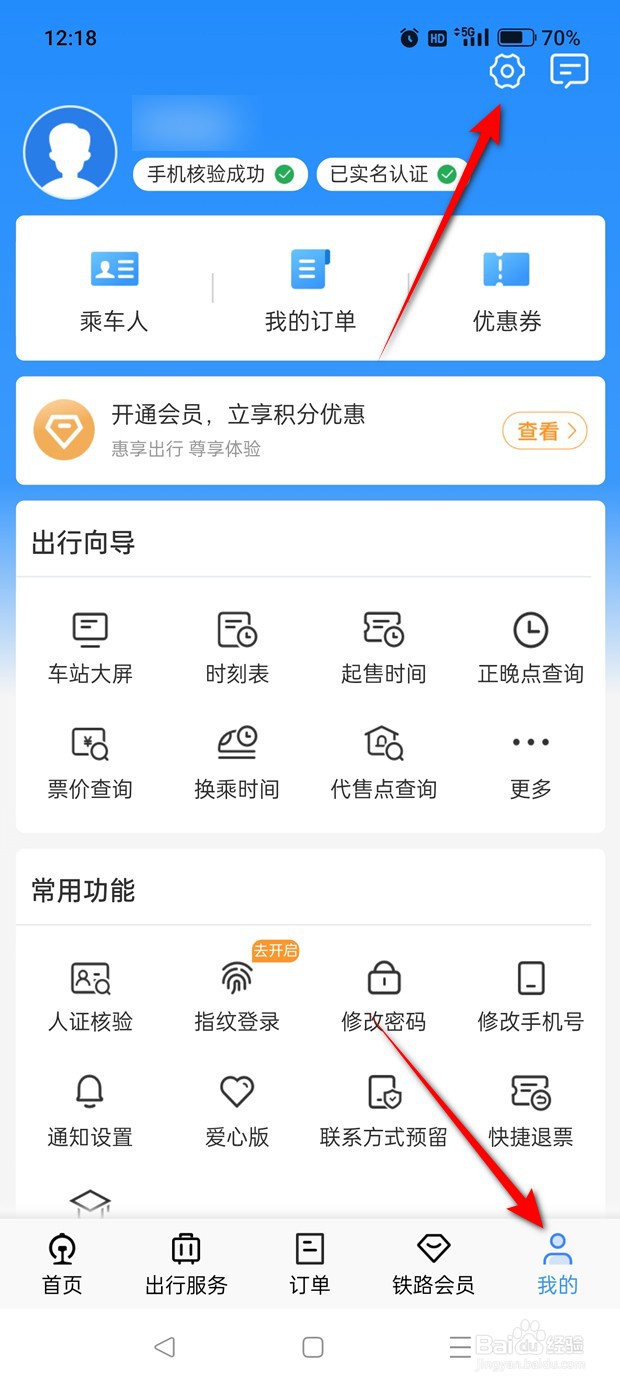 打开铁路12306我的页面,点击右上角的小齿轮图标进入。