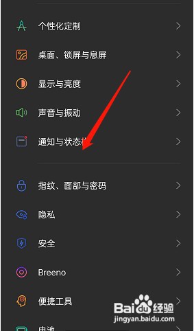 首先,我们打开手机<设置>页面,下滑找到“通知与状态栏”点击进入