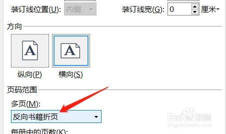 3、进入【页面设置】后,点击如下图所示的选项框,选择【反向书籍折页】即可。