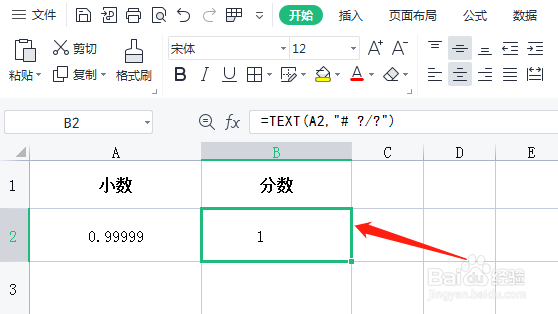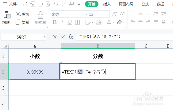 在B2单元格,输入函数公式“=TEXT(A2,"# ?/?")”。