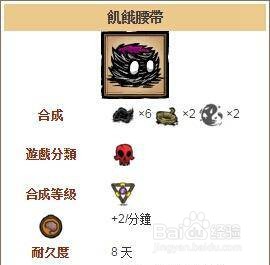 装备时每分钟恢复2 理智并减少40%饥饿损失。大部分的角色使用腰带时, 每天的饥饿值损失会由75点减少至45点,沃尔夫冈每天的饥饿值损失会由135点减少至67.5点,维斯则每天损失56.25点。以上就是对饥饿腰带作用的介绍。