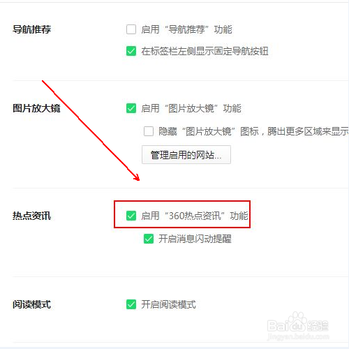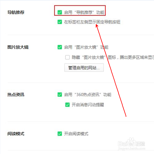 右侧找到【启用导航推荐功能】选项并去掉其复选框对勾