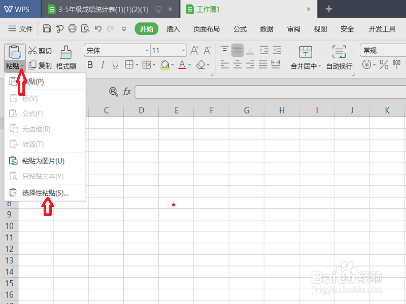 在快捷工具栏找到粘贴选项,点击下拉箭头,点击选择性粘贴。