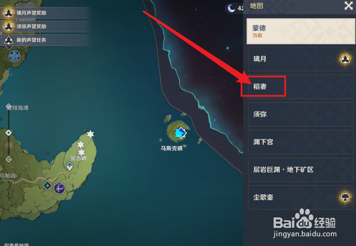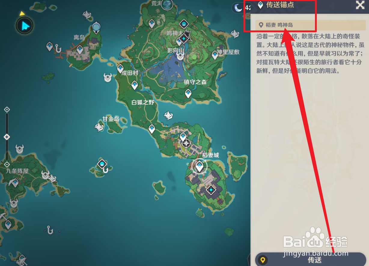 最后,在弹出的地图页面,点击使用“鸣神岛”传送锚点,即可传送进入稻妻。