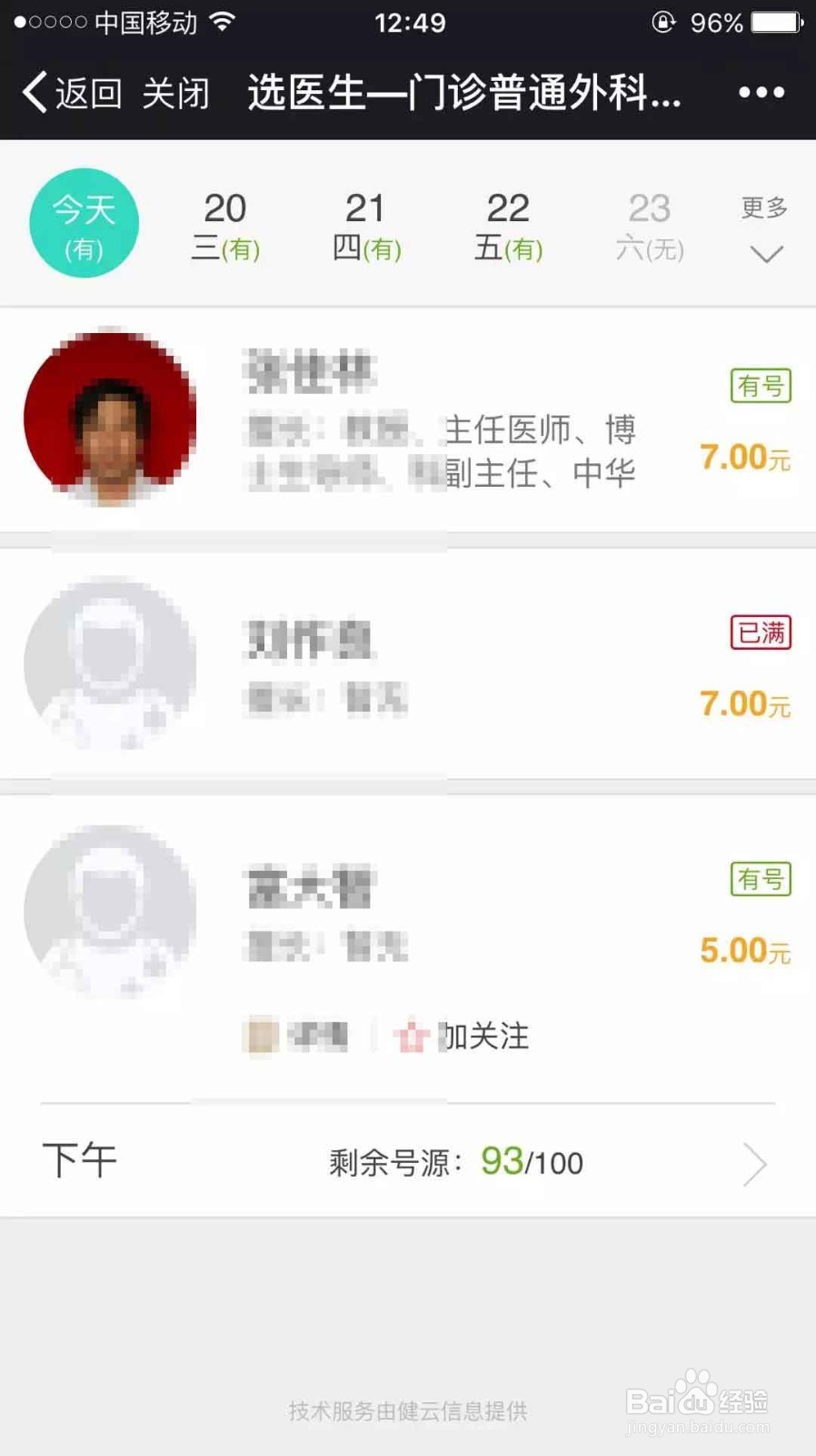 进入具体科室后,就看到可供选择的医生页面,后面都标有是否有号码的情况,你想挂谁的号,就在那里点击就可以,页面上选择的是挂号当天的号码。如果你还没有注册或者是没有登录,这时候会出现要求登录或者注册的页面。