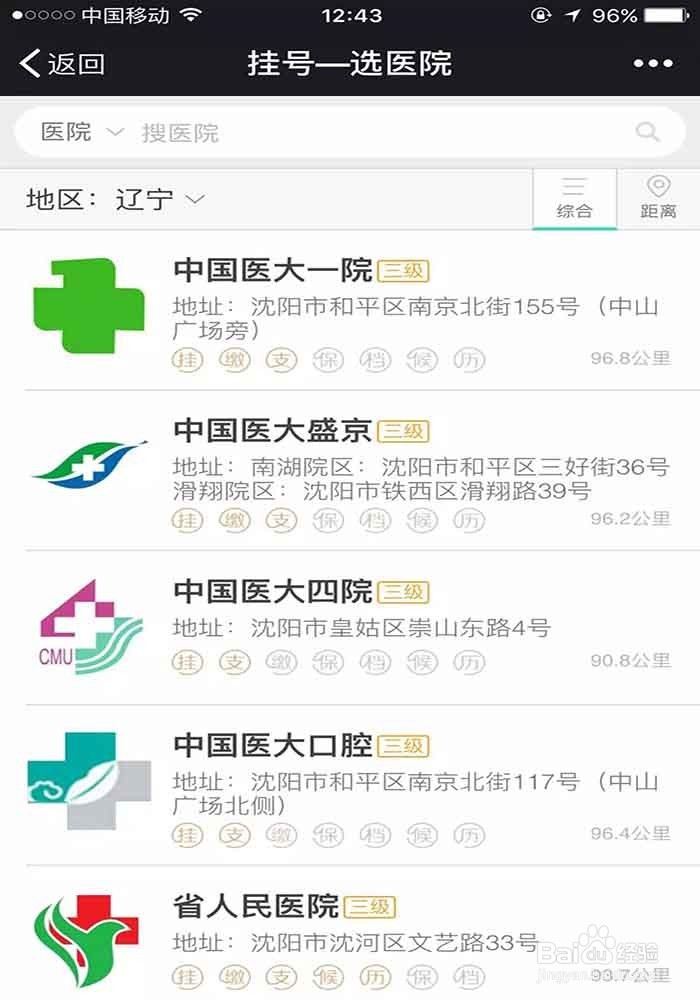 点击挂号标识后,会出现各个医院供你选择的页面,以中国医科大学附属第一医院为例。