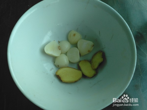 生姜切成姜片用来去腥,大蒜扒皮后改刀切片,用来体香去腥