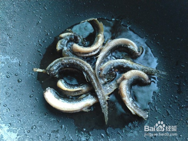 锅中倒油炒一下泥鳅去腥味,炒到泥鳅变成弯曲即可下姜蒜去腥体香