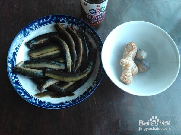准备适量的泥鳅宰杀干净,取出内脏,去头去尾后切成段备用,准备生姜一个备用