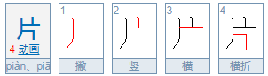 片(拼音:piàn、piān、pàn),是汉语通用规范一级字(常用字)。此字始见于甲骨文。本义指将木头一分为二,后引申为一半、片面、片状物等义,也可用为量词。