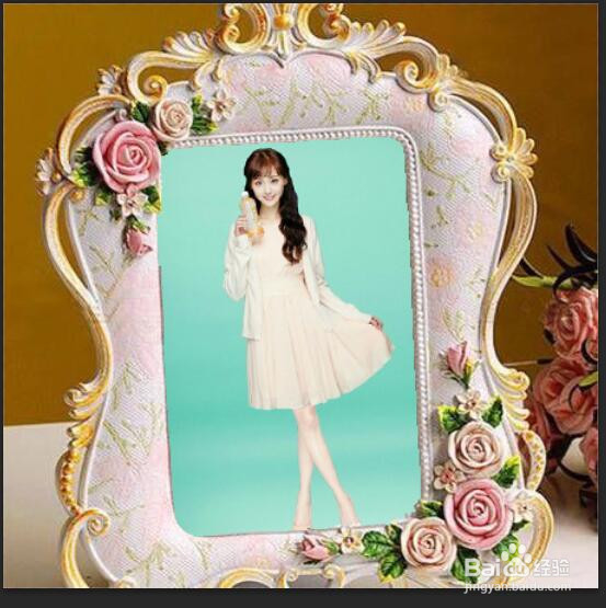 回到刚刚相框的界面,Ctrl+Alt+Shift+V,把图片复制到相框里。(小编用过ps cs4,和cs6略不同,cs4回到相框界面后,先Ctrl+Shift+I反选选区,再Ctrl+Alt+Shift+V,把图片复制到相框里。)现在相框和图片在一起了。如图