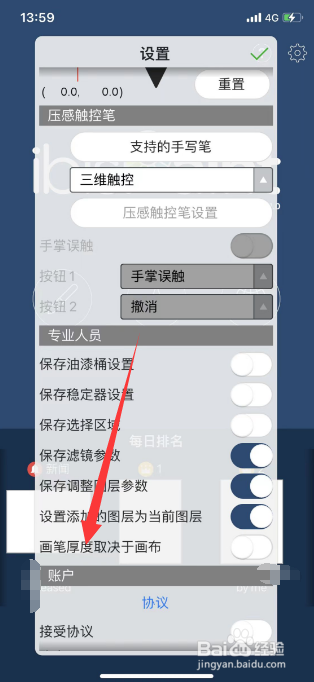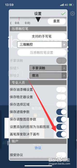 然后在设置页面的下方找到画笔厚重取决于画布的开关