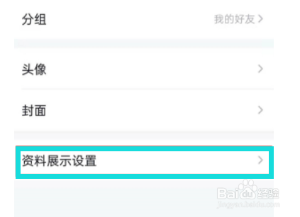 3.然后点击资料卡设置按键,然后在出现的选项中点击资料展示设置。