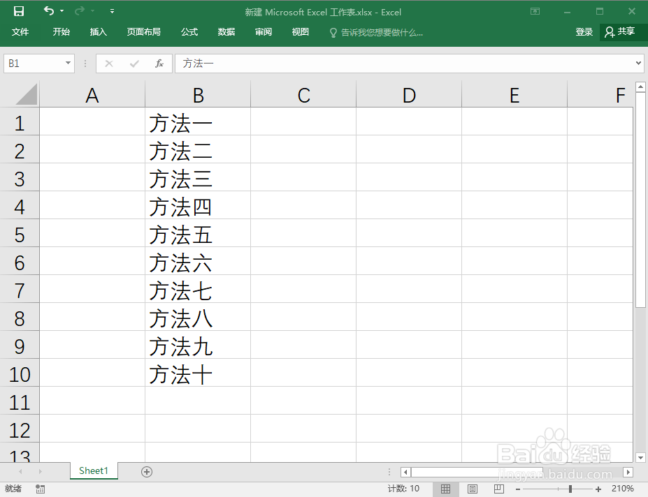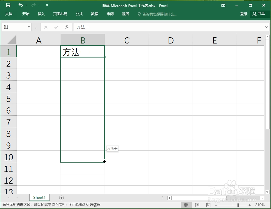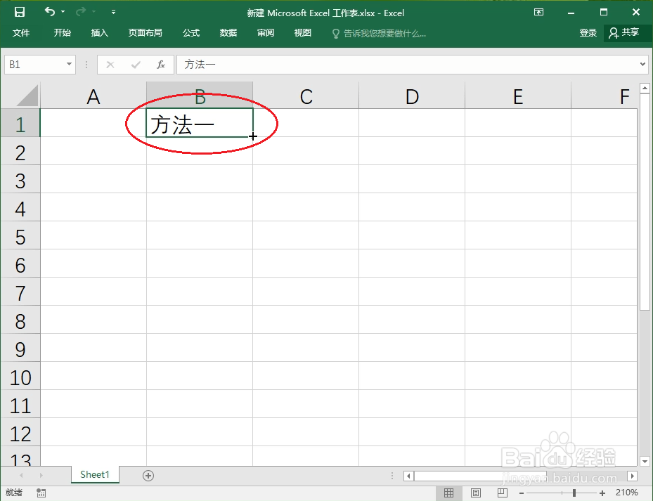 ● 在“B1” 单元格中输入“方法一”,并选中该单元格;