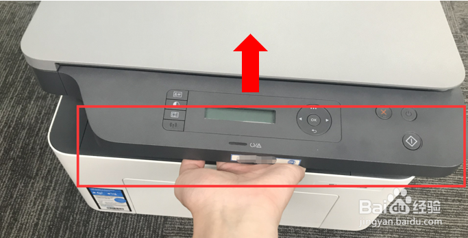 首先建议取出硒鼓,向上抬起扫描仪面板。
