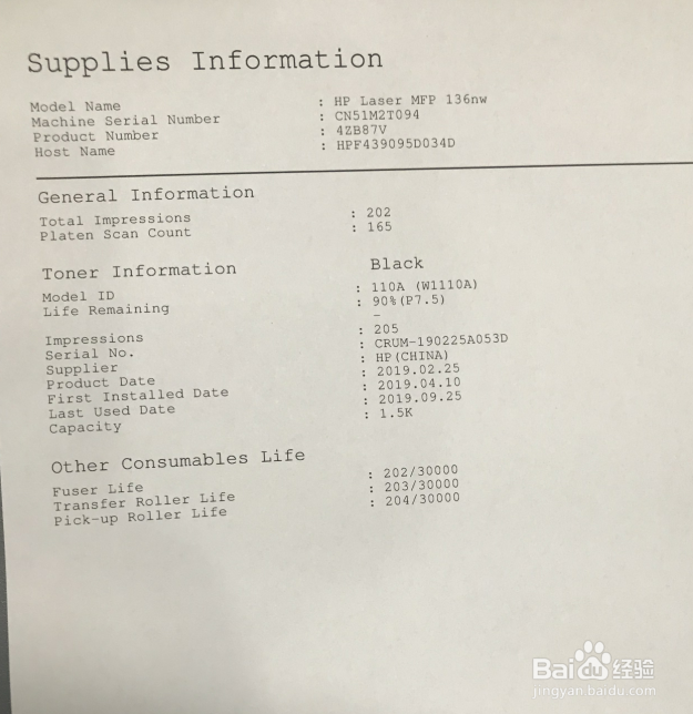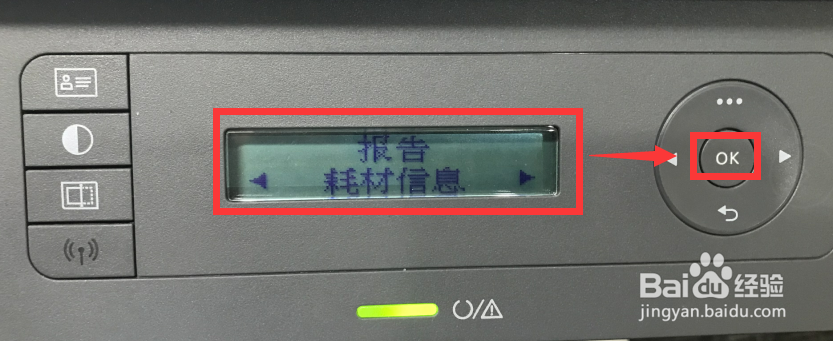 在设置菜单中找到系统设置——报告——耗材信息按OK键打印耗材信息页。