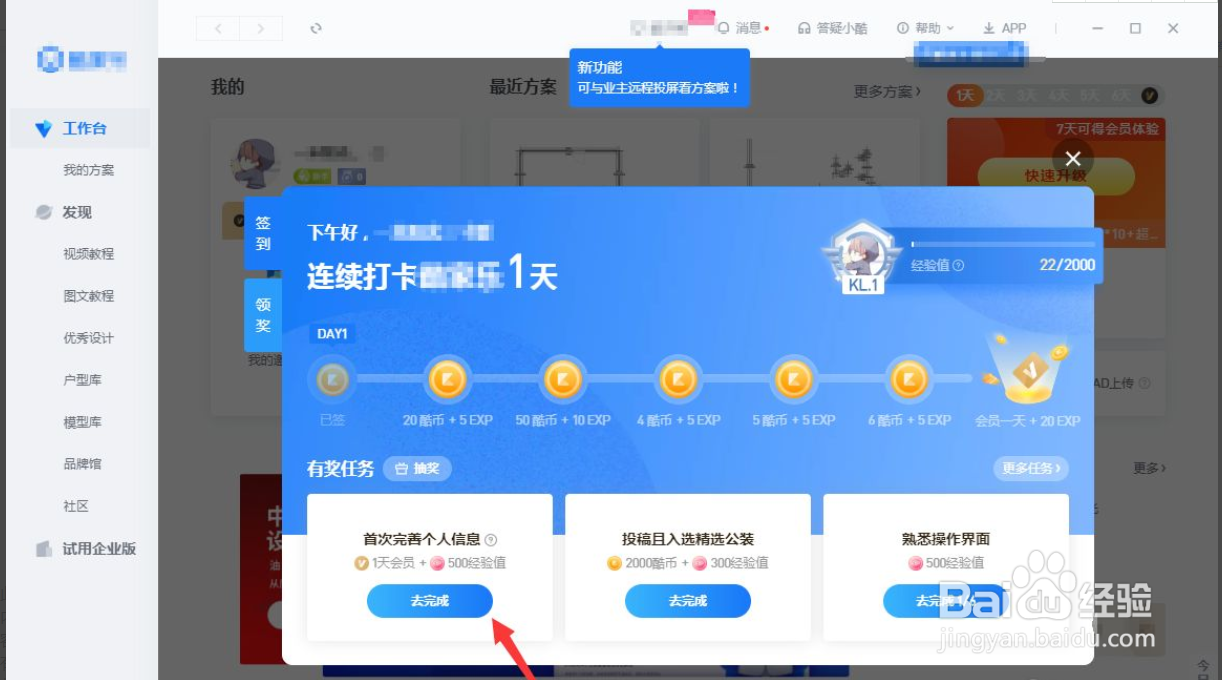 点击进行打卡,其中首次完善个人信息可得一天会员体验,点击去完成。