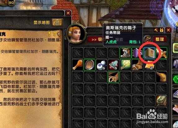 接到任务以后,我们打开背包,我标记的这个物品就是要送的箱子