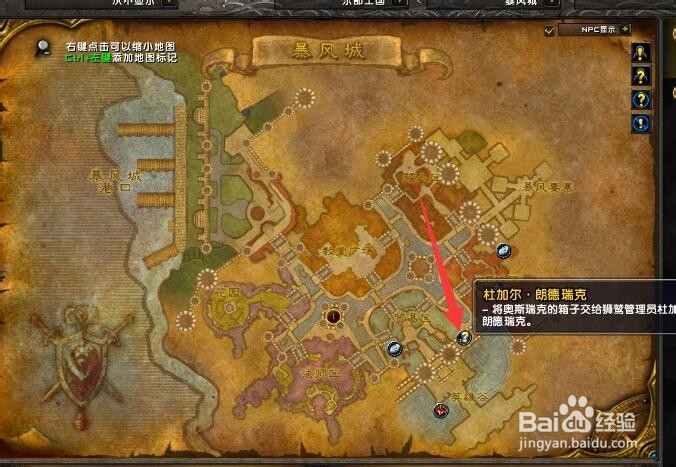 我们来到暴风城以后,打开小地图,在贸易区的右侧我们可以找到任务点