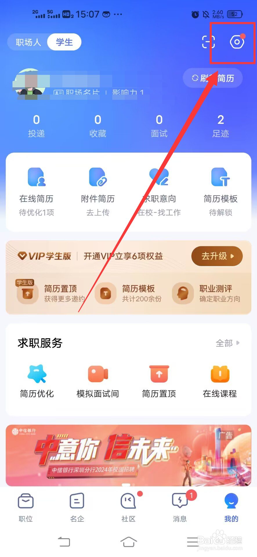 首先,打开智联招聘软件,打开右上角的【设置】图标。