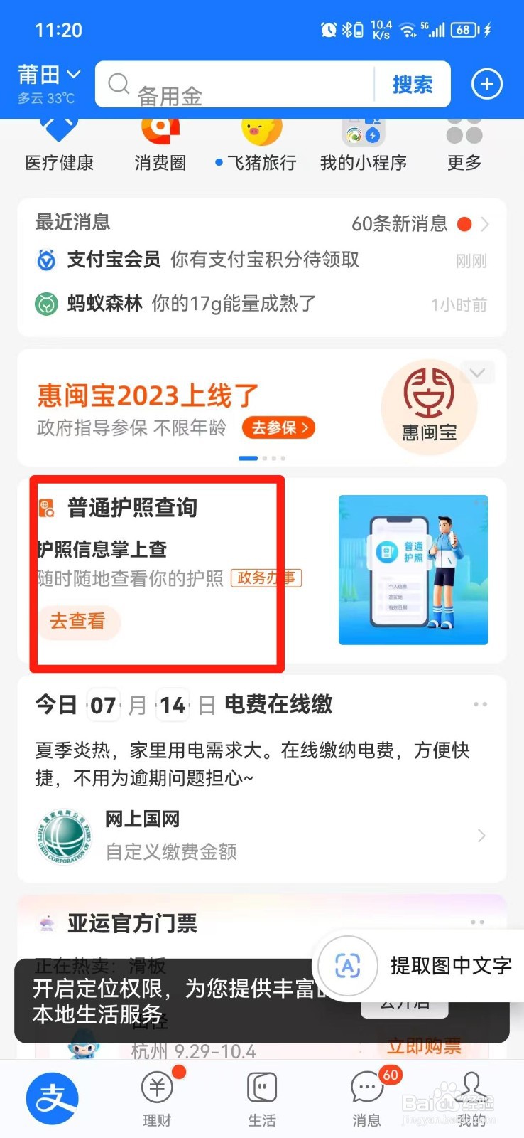 第一步:打开支付宝,在首页点击【普通护照查询】