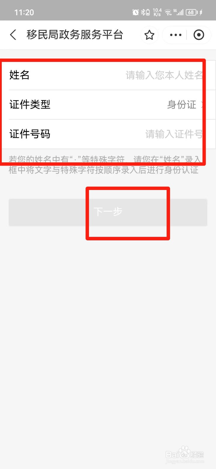 第三步:最后输入姓名和身份证号,点击【下一步】即可进入查询护照信息