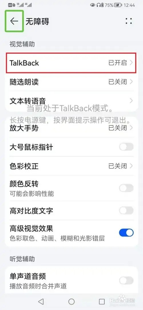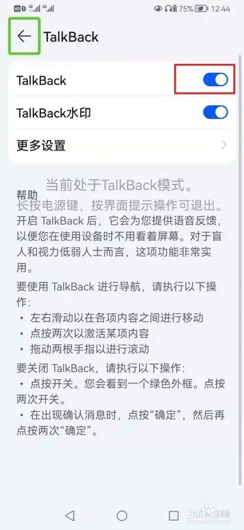 进入TalkBack设置页面,关闭【TalkBack】开关即可。